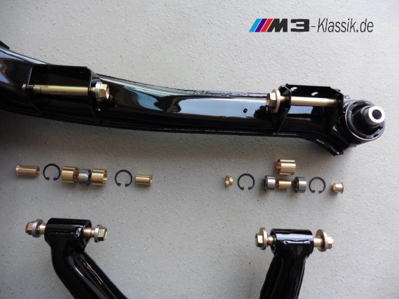Es sind bei beiden Schräglenkern Gelenklager eingebaut, um die Hinterachse stabiler zu machen und um die Spur einzustellen.